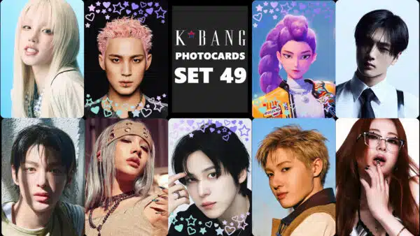 plus Photocard Set #49 (neun Photocards, drei davon mit exklusivem Hologramm-Druck): Yunho (Ateez) ● Keonho, Martin (Cortis) ● Jay (Enhypen) ● Rumi (Huntr/x, Kpop Demon Hunters) ● Yuqi (I-dle) ● Yunjin (Le Sserafim) ● Mingyu (Seventeen) ● Rui (XLOV)