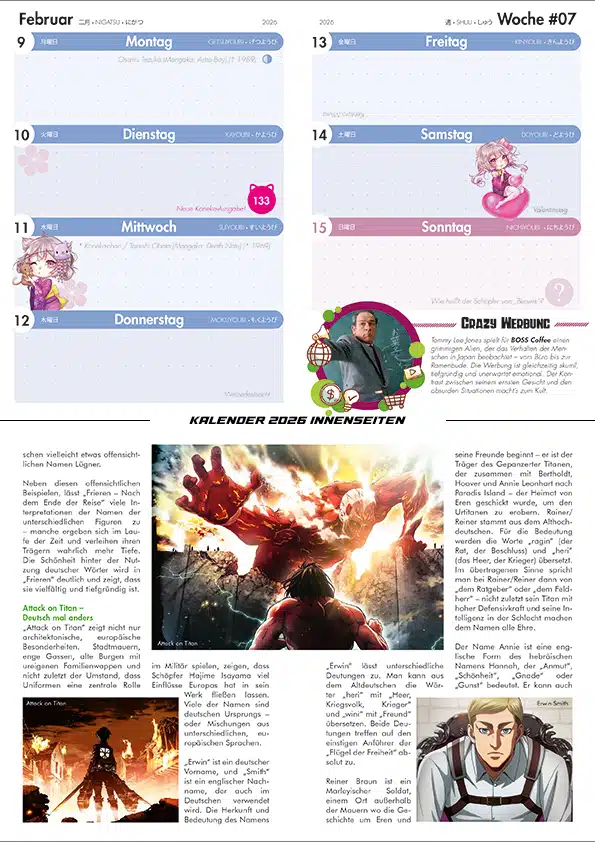Der „Koneko Kalender 2026″ beinhaltet einen übersichtlichen Wochenplaner, die wichtigsten Termine (für Deutschland und Österreich), Stundenpläne, Geburts- und Todestage berühmter Persönlichkeiten aus der Manga- und Anime-Szene, jede Menge Wissenswertes und Fun-Facts, spannende Artikel, eine wöchentliche Rätselfrage, Shopping-Tipps, redaktionelle Empfehlungen und vieles mehr. Und alles verpackt in ein stimmungsvolles J-Style-Design und mit ausreichend Platz für eigene Notizen.