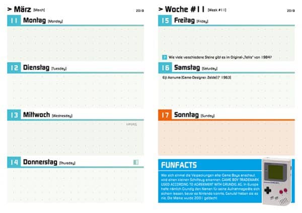 + Übersichtliches Wochenkalendarium mit Platz für eigene Termine und Notizen